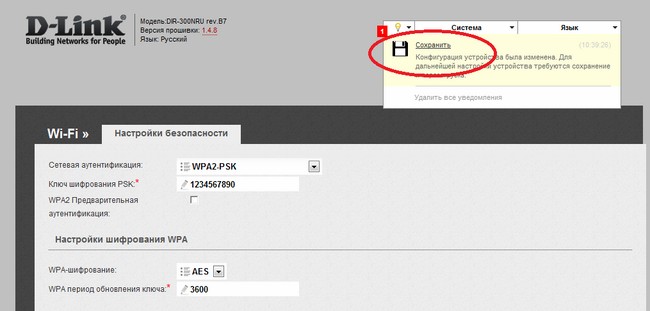 В меню Настроки безопасности в поле Сетевая аутентификация выберите WPA2_PSK. В поле Ключ шифрования PSK введите не менее 8-ми цифр и букв. Это будет "пароль на wifi". В поле WPA-шифрование выберите AES и нажмите кнопку Изменить справа внизу страницы.